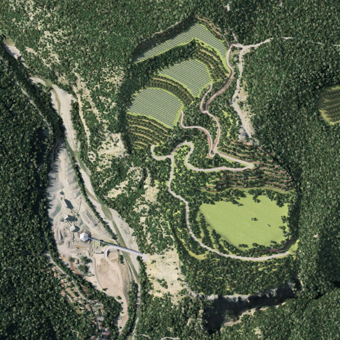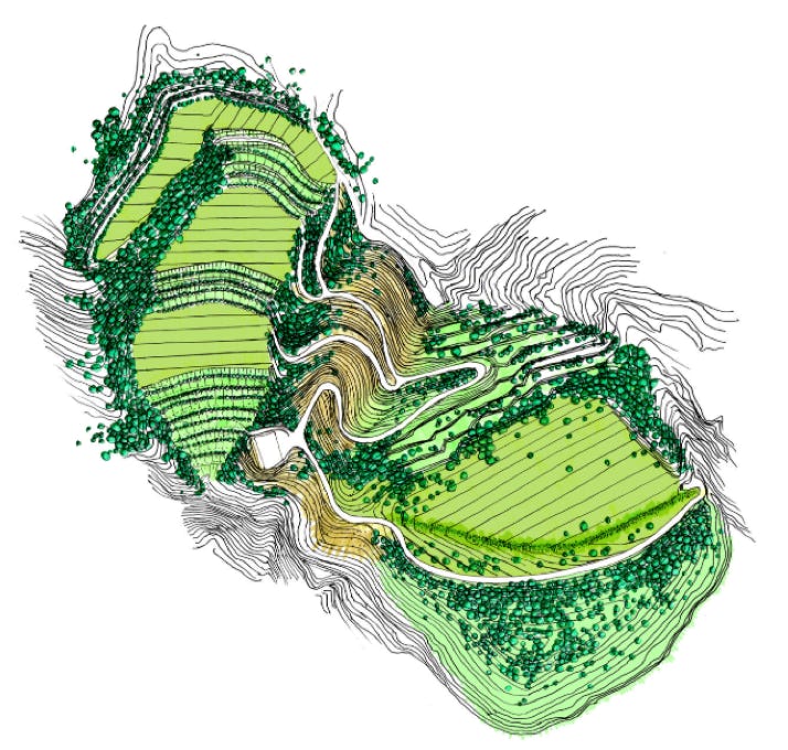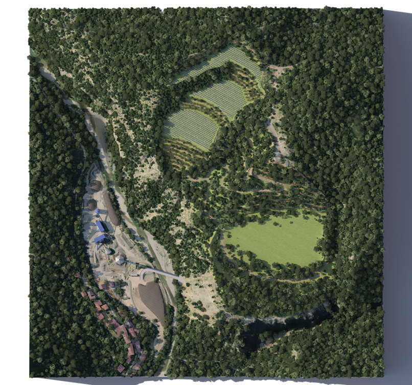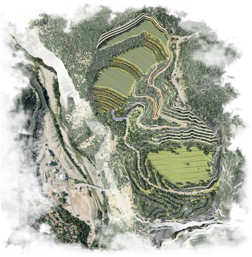 Restauration des lignes de crêtes et des fonds de vallons pour gérer l’eau, retrouver les continuités paysagères et biodynamiques. Travail sur les formes environnantes, la géologie et la flore locale, comme pistes de réflexion pour recomposer un nouveau paysage pour le versant Sud du Suc du Garsi. Le futur aspect paysager du site a été imaginé avec une intégration et une prise en compte du territoire et du terroir, sur sa portée humaine et avec une volonté de contribuer à l’économie locale et circulaire.